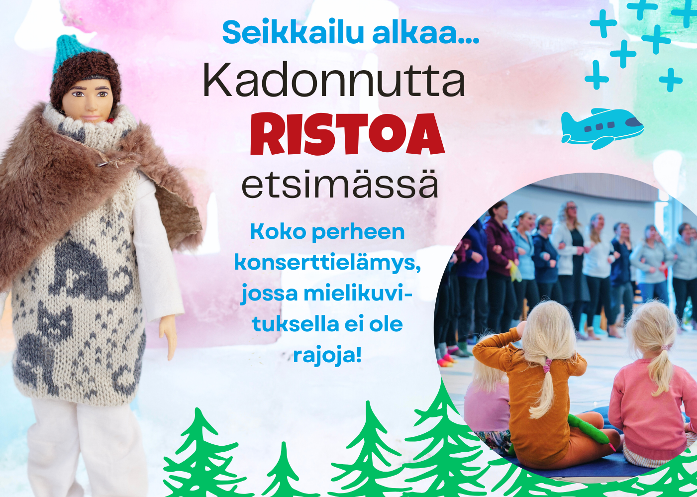 Ristoa etsimässä on osallistava ja tarinallinen konsertti, jossa yhdistyvät kuorolaulu, tarina ja leikki. Esitys vie kuulijat jännittävälle matkalle – koko perheen konserttielämys, joka ilahduttaa erityisesti lapsia.
