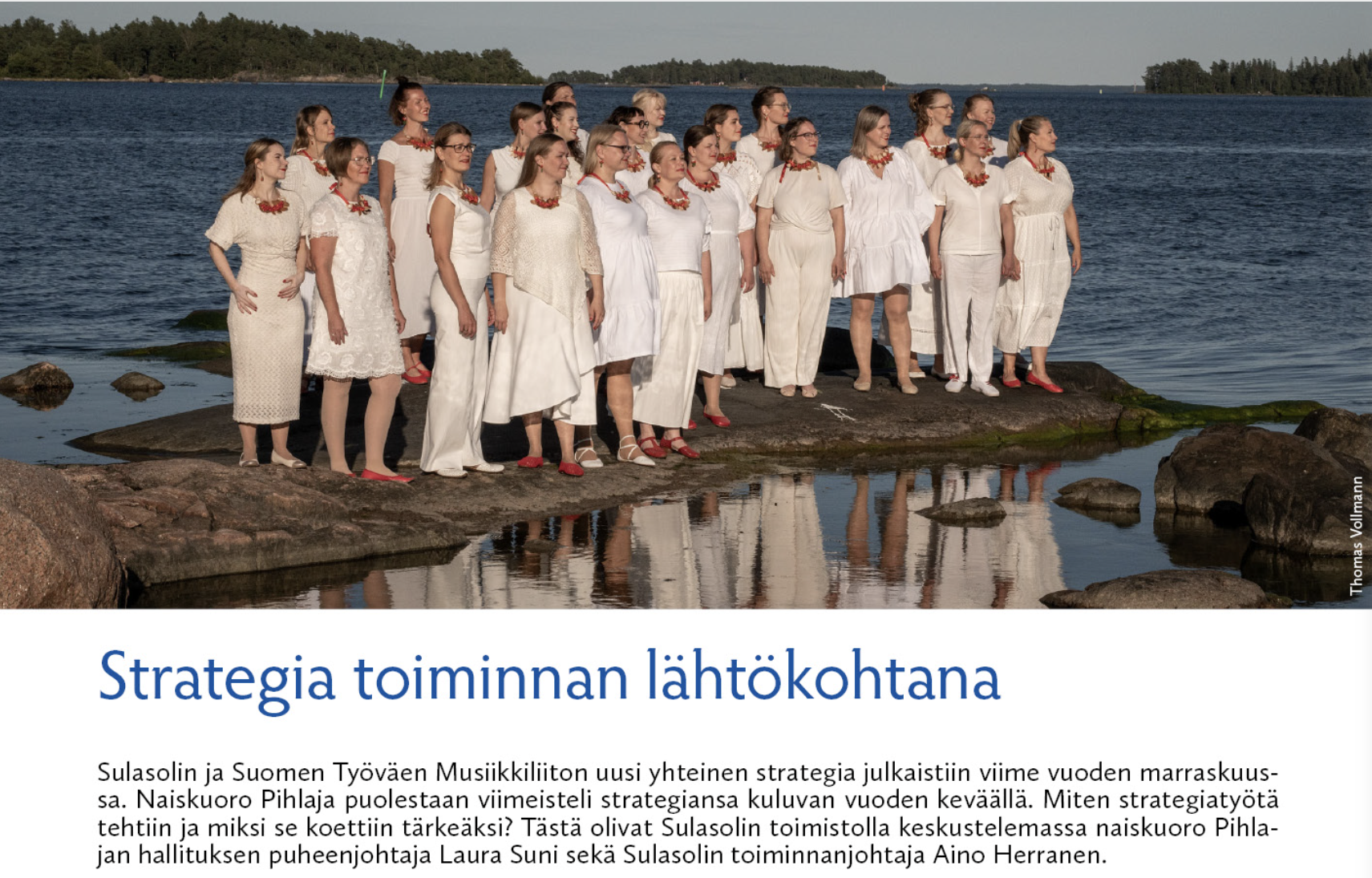 Naiskuoro Pihlaja loi kuorokaudella 2024-2025 itselleen strategian, mission, vision ja arvot. Tästä prosessista voi lukea Sulasol-lehdestä, osana laajempaa juttua Sulasolin ja kuorojen strategiatyöstä.